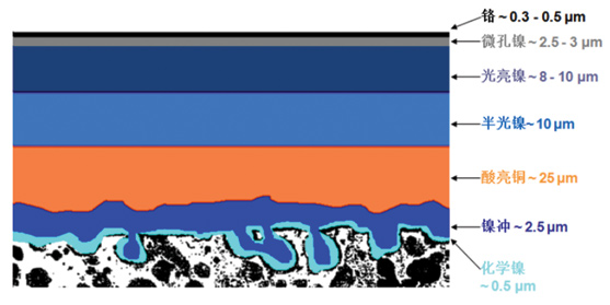 → 酸浸 → 水洗 → 半光镍 → 光亮镍 → 水洗 → 酸洗 → 水洗 → 沙丁镍 → 水洗 → 微孔镍